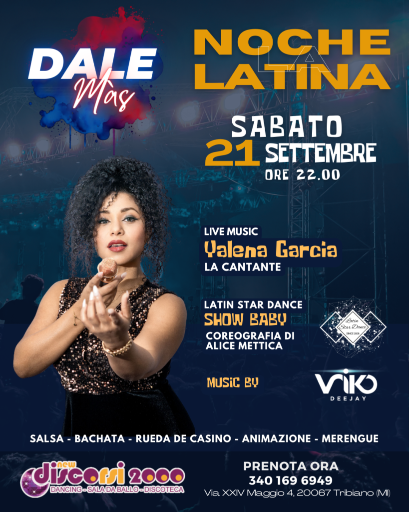 Se sei alla ricerca di una serata indimenticabile all’insegna della musica e del ballo, non cercare oltre! Dale Màs è lieto di presentarti Yalena GarcIa – La cantante- in un evento che ti porterà direttamente nelle strade della Habana per una notte di puro divertimento e passione latina! Preparati per una serata unica, dove la musica dal vivo, i balli sensuali e l’atmosfera cubana ti faranno dimenticare ogni preoccupazione e ti faranno vivere al massimo il calore e la gioia della cultura latina!